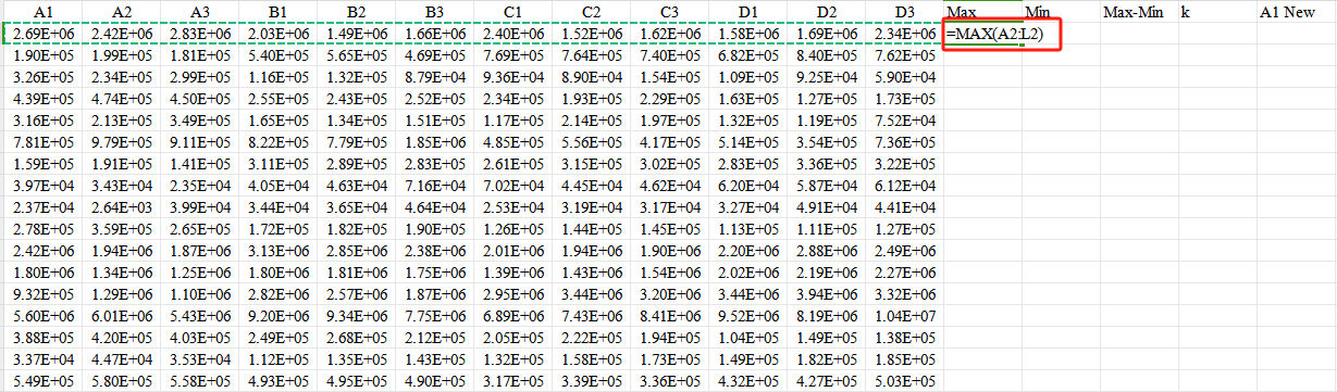 First,use the Max and Min functions in Excel to obtain the maximum and minimum values of the data row.